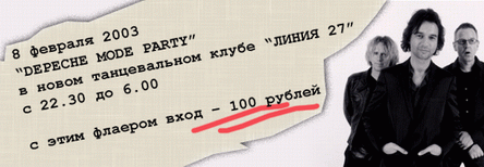 Для всех распечатавших флаер и пришедших в фирменных майках Depeche Mode, синти-поп и индастриал групп вход 100 рублей, для остальных 150 рублей.