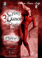 Cyber 3Dance Party *– это танцевальный конкурс (контест) в рамках вечеринки для поклонников таких экстремальных стилей, как dark electro, tbm, rhythm`n`noise, aggrotech. Каждый желающий сможет принять участие в танцевальной битве, победителем которой станет тот, чей cyber-танец будет наиболее красивым, профессиональным или оригинальным. Выбирать победителя предстоит всем присутствующим на танцполе. Cyber 3Dance Party рассчитаны не только на желающих продемонстрировать свои танцевальные способности, но и просто на любителей жесткой электронной музыки, для которых сражение cyber-танцоров станет отличным дополнением к музыкальной программе вечера, а возможно, даже заставит впоследствии взять пару уроков у победителя.