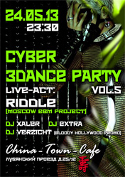 Cyber 3Dance Party *– это танцевальный конкурс (контест) в рамках вечеринки для поклонников таких экстремальных стилей, как dark electro, tbm, rhythm`n`noise, aggrotech. Каждый желающий сможет принять участие в танцевальной битве, победителем которой станет тот, чей cyber-танец будет наиболее красивым, профессиональным или оригинальным. Выбирать победителя предстоит всем присутствующим на танцполе. Cyber 3Dance Party рассчитаны не только на желающих продемонстрировать свои танцевальные способности, но и просто на любителей жесткой электронной музыки, для которых сражение cyber-танцоров станет отличным дополнением к музыкальной программе вечера, а возможно, даже заставит впоследствии взять пару уроков у победителя.