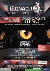 Наконец-то свершилось! Белорусская группа COSMOPOLITE, также известная под именем ЛИЦЕЙ, представит вам свой новый альбом HYPNO! После выдающегося выступления на одной сцене с мэтрами Camouflage и выпуском взорвавшего synth-сцену сингла NO PAIN группа представит вам новую музыкальную программу 14 ноября в московском клубе MONACLUB. Не пропустите! Только в этот вечер вы услышите новые песни, а также уже ставшие популярными хиты!