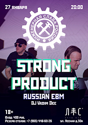 27 января в клубе "ЛЕС" состоится концерт группы STRONG PRODUCT, яркого представителя российской EBM сцены. Коллектив который умудрился сломать не только носы, руки и ноги, но и все существовавшие на тёмной отечественной сцене каноны, запев на русском, быстро став любимцами далеко за пределами русской индастриал тусовки. Неотвратимый пи**ец, знакомый каждому русскому человеку, с колкой сатирой и прокачкой из жесткого бита электро панка, по заветам DAF, Nitzer Ebb и ранних Die Krupps, более известного как EBM. Как и братский проект D.B.S. они уже давно любимчики на немецком фестивале FAMILIEN TREFFEN. На последнем, самом крупном отечественном фестивале synth и industrial музыки, SYNTHETIC SNOW, выступление группы Крепкий Продукт стало одним из самых ожидаемых, собрав на танцполе самых верных поклонников.
