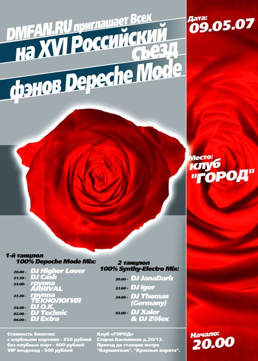 XVI Российский съезд фэнов Depeche Mode состоится в модном московском техно-клубе "ГОРОД". Оснащённый современным световым и звуковым оборудованием, имеющий два просторных танцзала - это более 900 кв.м, клуб "ГОРОД" сможет одновременно принять более 1000 человек. Праздничная программа начнётся в 20.00 и завершится в 6.00.