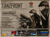 Вот уже год вечеринки серии TanzFronT являются заметным явлением московской электронной сцены, за это время мы успели немало сделать, не раз радуя поклонников ритмичного нойза и и прочих близких ему стилей выступлениями лучших отечественных и российских проектов и диджеев, завершив прошлый сезон беспрецедентным для нашего формата по количеству зарубежных гостей фестивалю TanzFronT TotalFesT. В рамках нашей серии приняли участие такие ведущие коллективы, пользующиеся заслуженной международной известностью, как Mono No Aware (Германия), Proyecto Mirage (Испания), Asche (Германия), Morgenstern (Германия), Coreline (Великобритания), Hypnoskull (Бельгия). Молодая российская rhythm’n’noise сцена была представлена такими набирающими силу и завоевывающими популярность проектами, как Id Molotov, DJ Golub и Teknolust и др., постоянными гостями диджейской ТанцФронТа были DJ JanaDark, DJ Negative, DJ Distant, DJ Oscillator, DJ Technoshamen и пр.